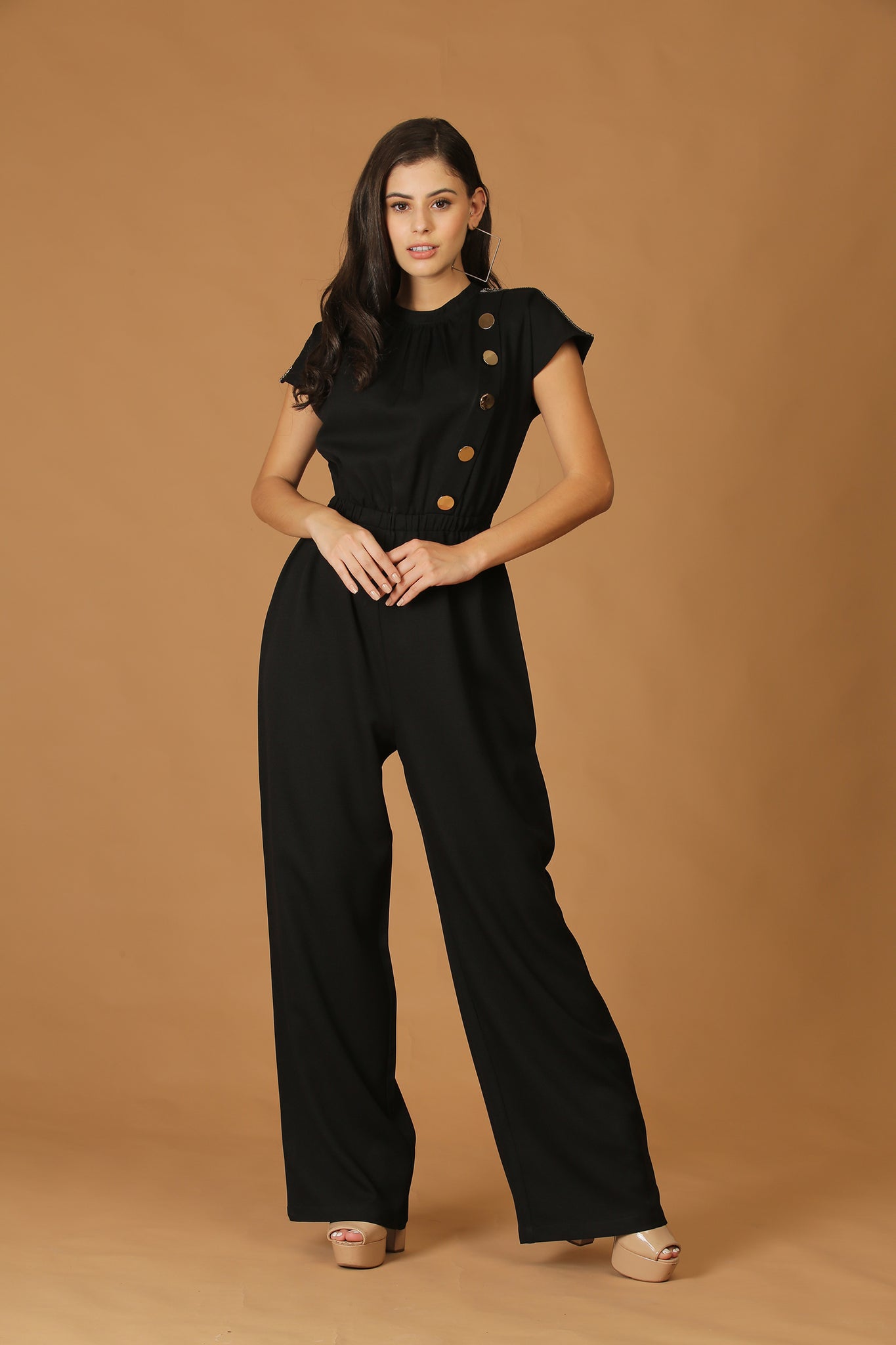This black jumpsuit is designed for effortless everyday elegance. Crafted in a soft, fluid fabric, it features a round neckline, short sleeves, and a comfortable elasticated waist that flatters the silhouette. Statement metallic button detailing along the front adds a modern accent, while the straight-leg fit ensures ease and versatility.
