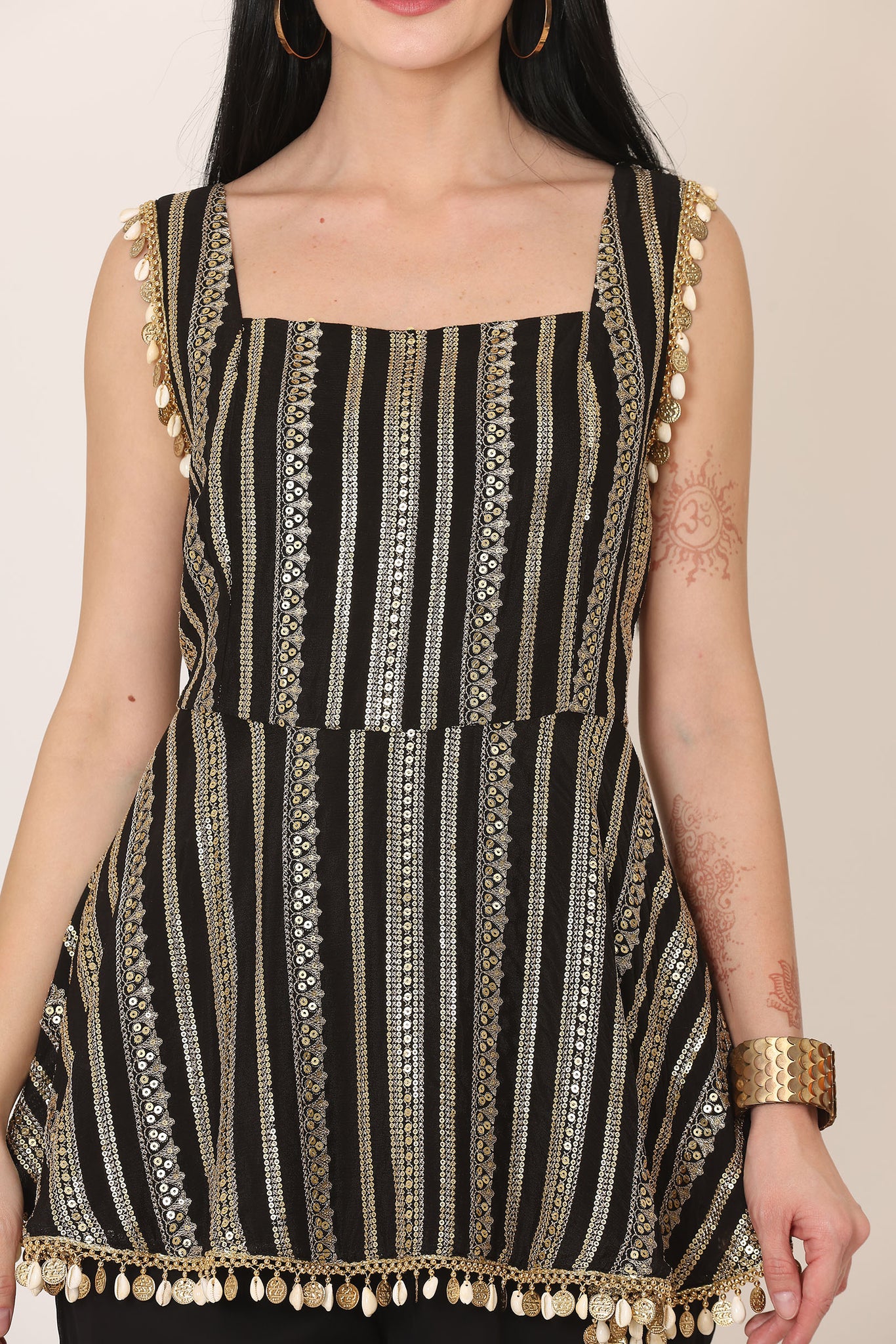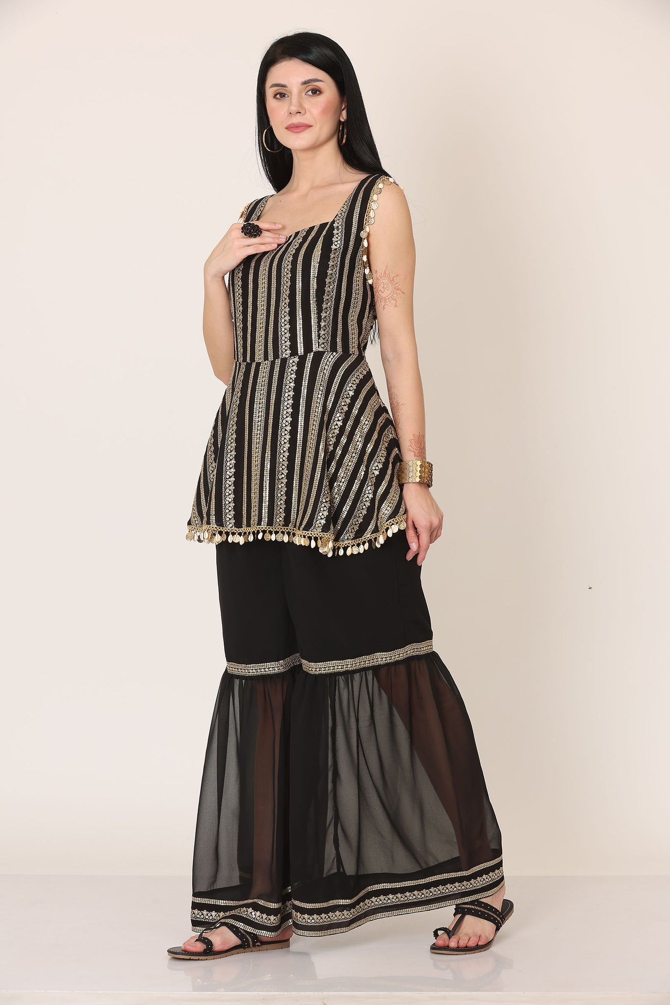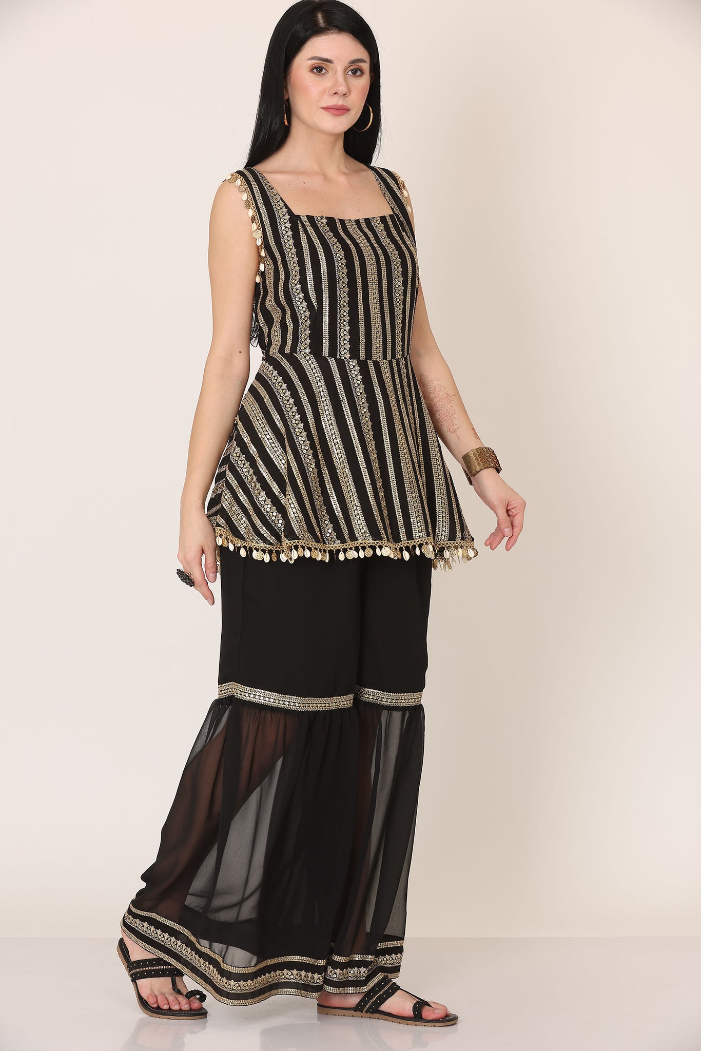 Make a statement with this elegant black co-ord set, designed to blend contemporary style with artisanal detailing. The sleeveless top features a structured square neckline and is adorned with vertical gold-toned embellishments that elongate the silhouette. Delicate coin detailing along the straps and hemline adds a festive touch and subtle movement. Paired with flowy black pants, the set is elevated with sheer panel detailing and fine embellished borders at the hem, creating a graceful layered effect.