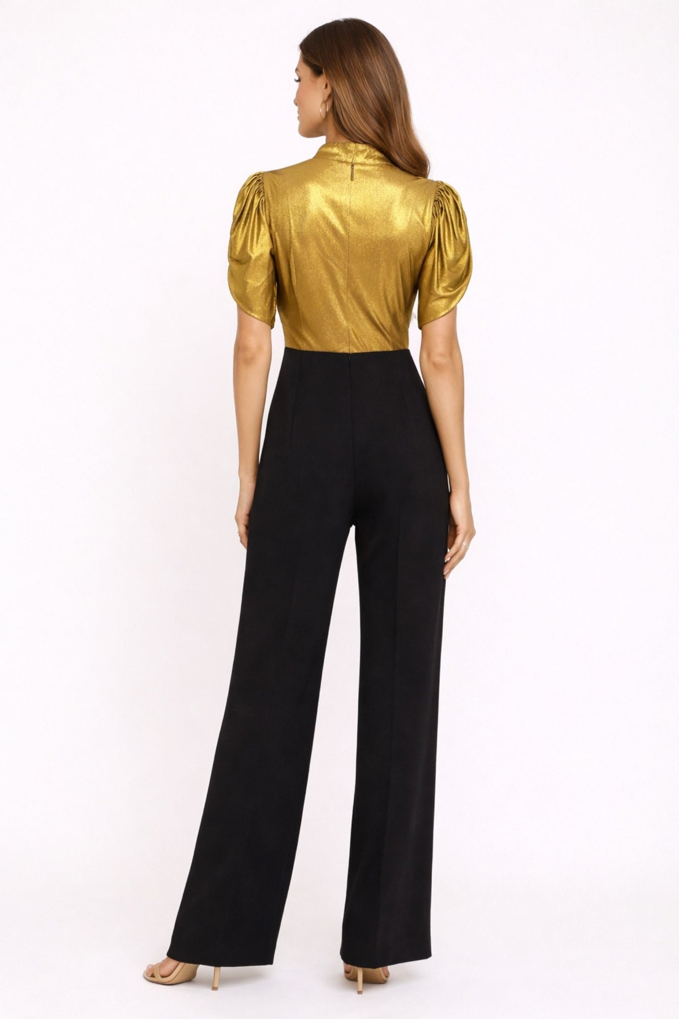 Elevate your occasion wear with this sleek and sophisticated jumpsuit crafted to make an impact. Designed in a lustrous gold-finish bodice with a high neckline and softly puffed sleeves, it brings a refined touch of glamour. The fitted waist flows seamlessly into tailored black wide-leg trousers, creating a clean, elongated silhouette.
