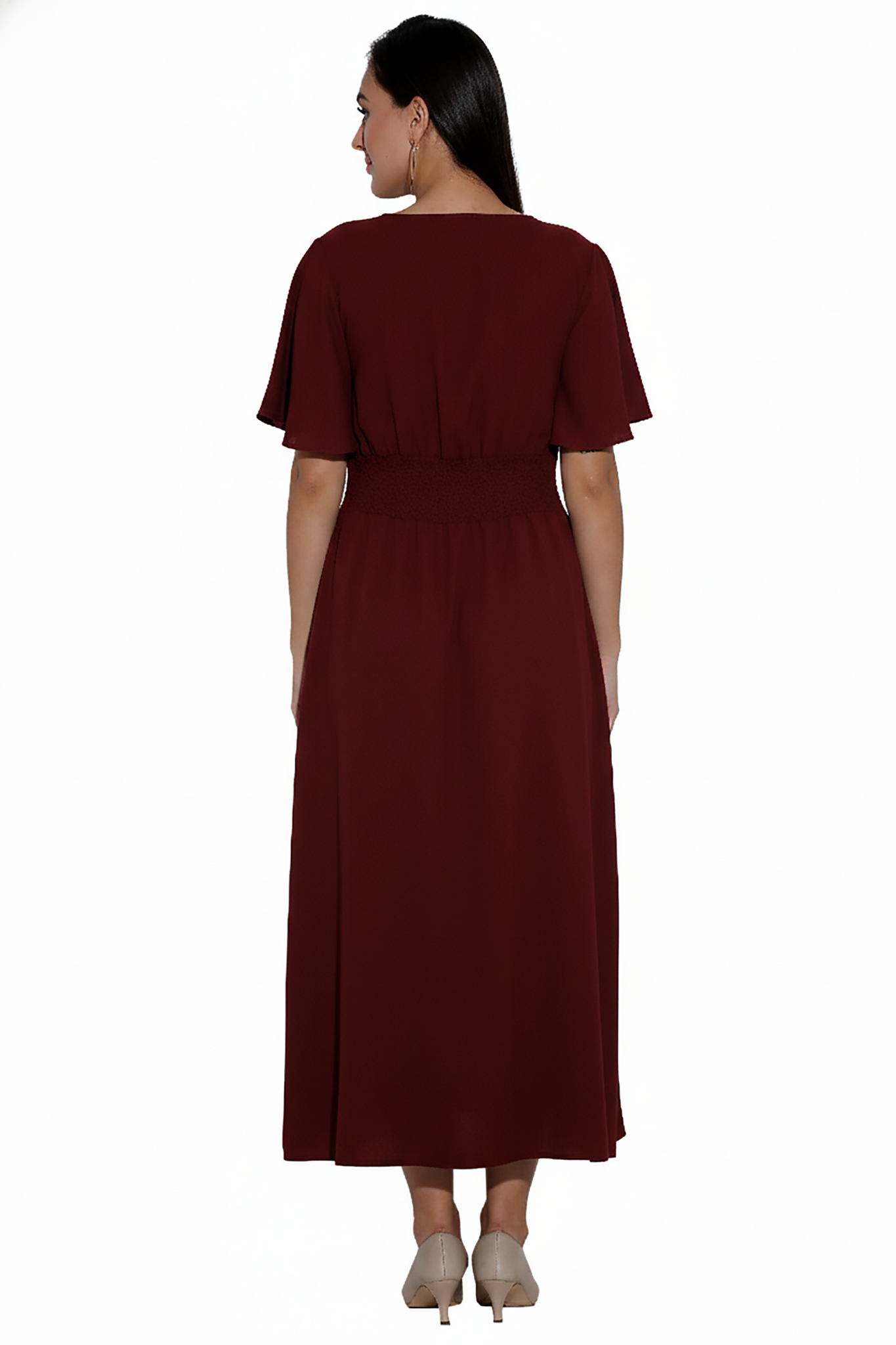 This elegant maroon midi dress is crafted in a soft, flowy fabric that drapes beautifully on the body. Designed with a V-neckline and flutter sleeves, it offers a feminine and effortless look. The smocked waist defines the silhouette while ensuring all-day comfort. Delicate floral embroidery along the skirt adds a touch of charm and color contrast.