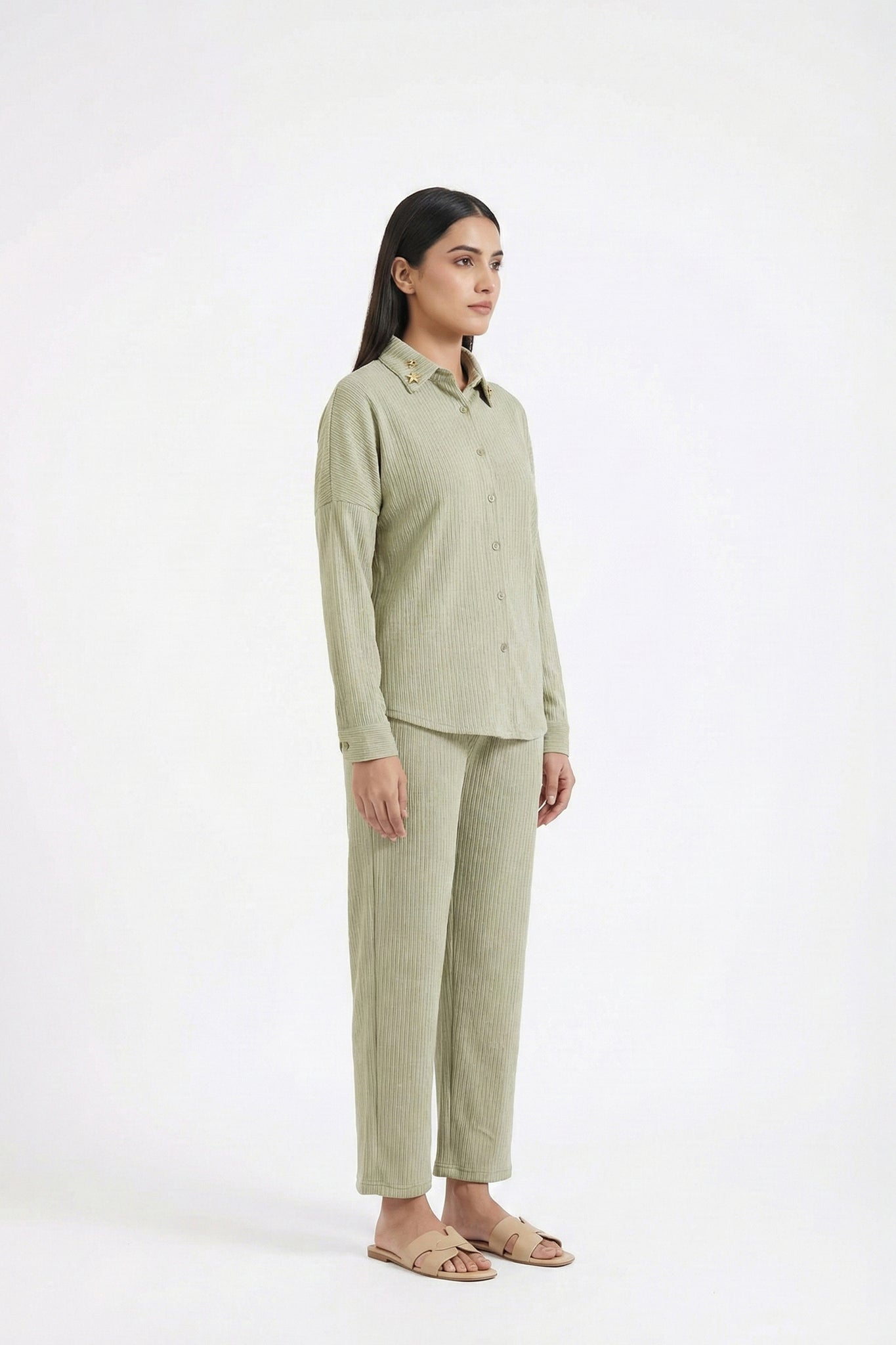 This mint green co-ord set offers effortless comfort with a refined, minimal aesthetic. The button-down shirt features a relaxed fit with a classic collar and subtle ribbed texture that adds soft structure to the look. Paired with matching straight-fit pants, the set provides easy movement and an understated, coordinated style.