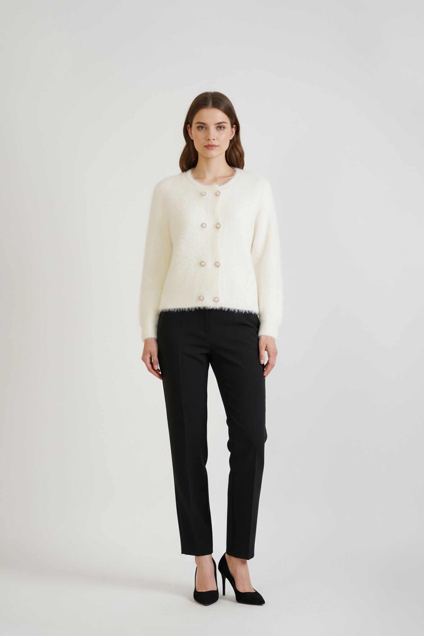 This off white sweater brings a refined, soft-touch elegance to everyday dressing. Designed with a round neckline and full sleeves, it features a sophisticated double-breasted front highlighted with pearl-embellished buttons. The subtly fuzzy knit adds a cozy, luxurious feel, while the straight hem keeps the silhouette polished and versatile.