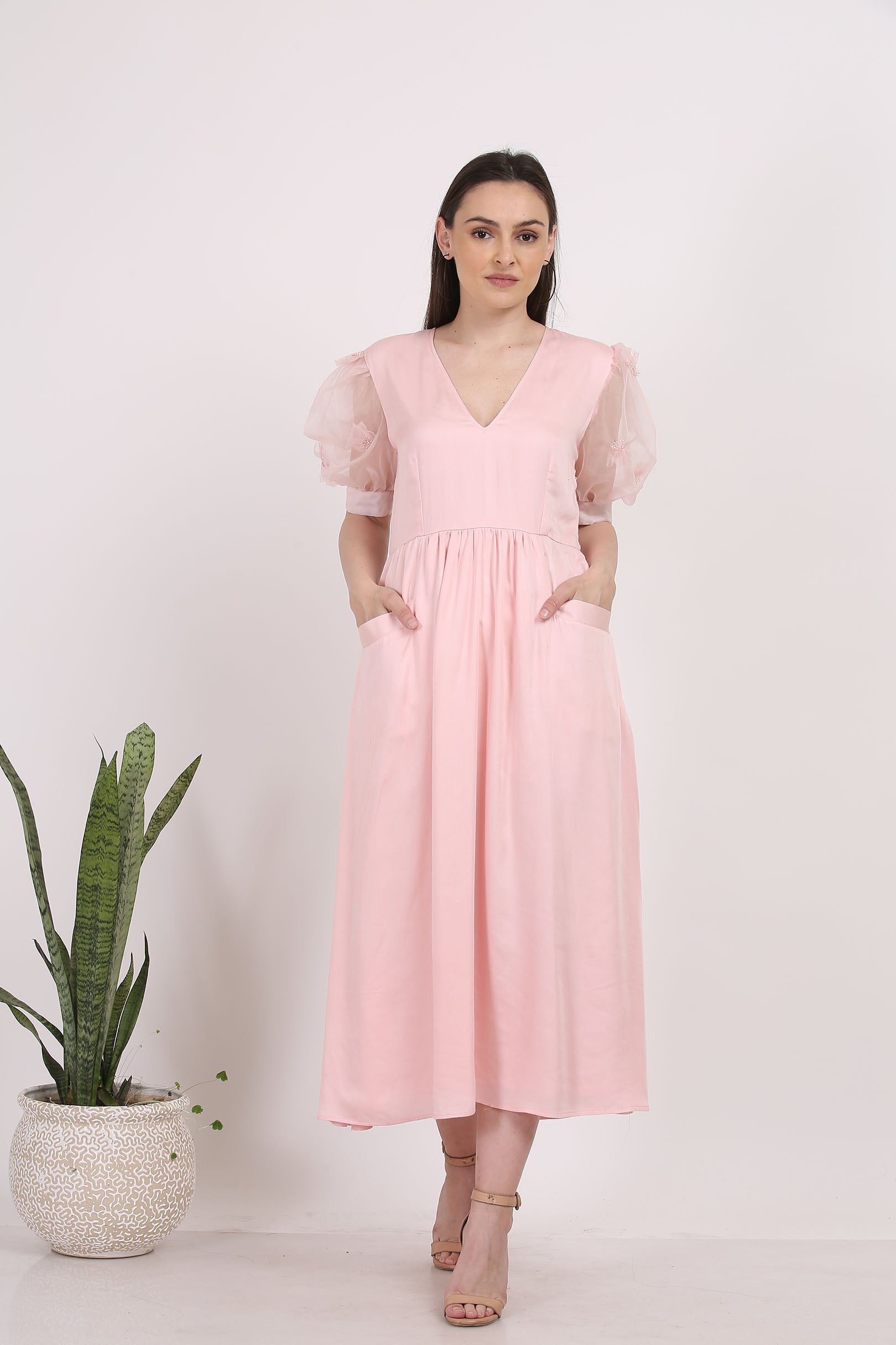 Elevate your everyday elegance with this soft blush midi dress, designed to balance comfort and femininity. Crafted in a lightweight fabric, the dress features a flattering V-neckline and a gently gathered waist that creates a graceful, flowy silhouette. The sheer organza puff sleeves add a delicate, romantic touch, while the relaxed fit ensures effortless wear. Finished with functional side pockets.
