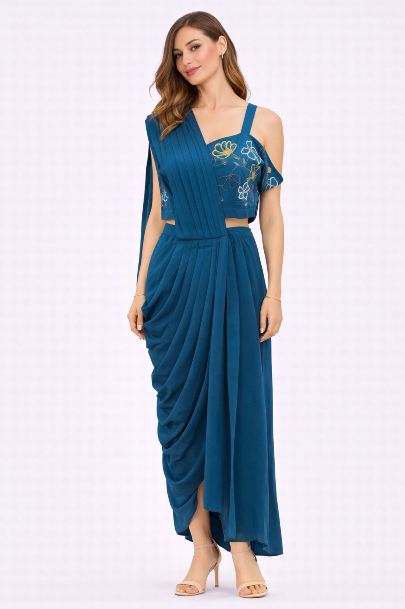 This elegant co-ord set blends contemporary draping with delicate detailing for a refined, modern look. The asymmetrical crop top features soft pleating across the bodice and a single-shoulder silhouette, enhanced with subtle floral embroidery that adds a touch of artistry and charm. Paired with a high-waisted, fluid draped skirt, the ensemble creates graceful movement and a flattering fall that elongates the frame. Crafted in a rich teal hue, this outfit strikes the perfect balance between structure and softness.