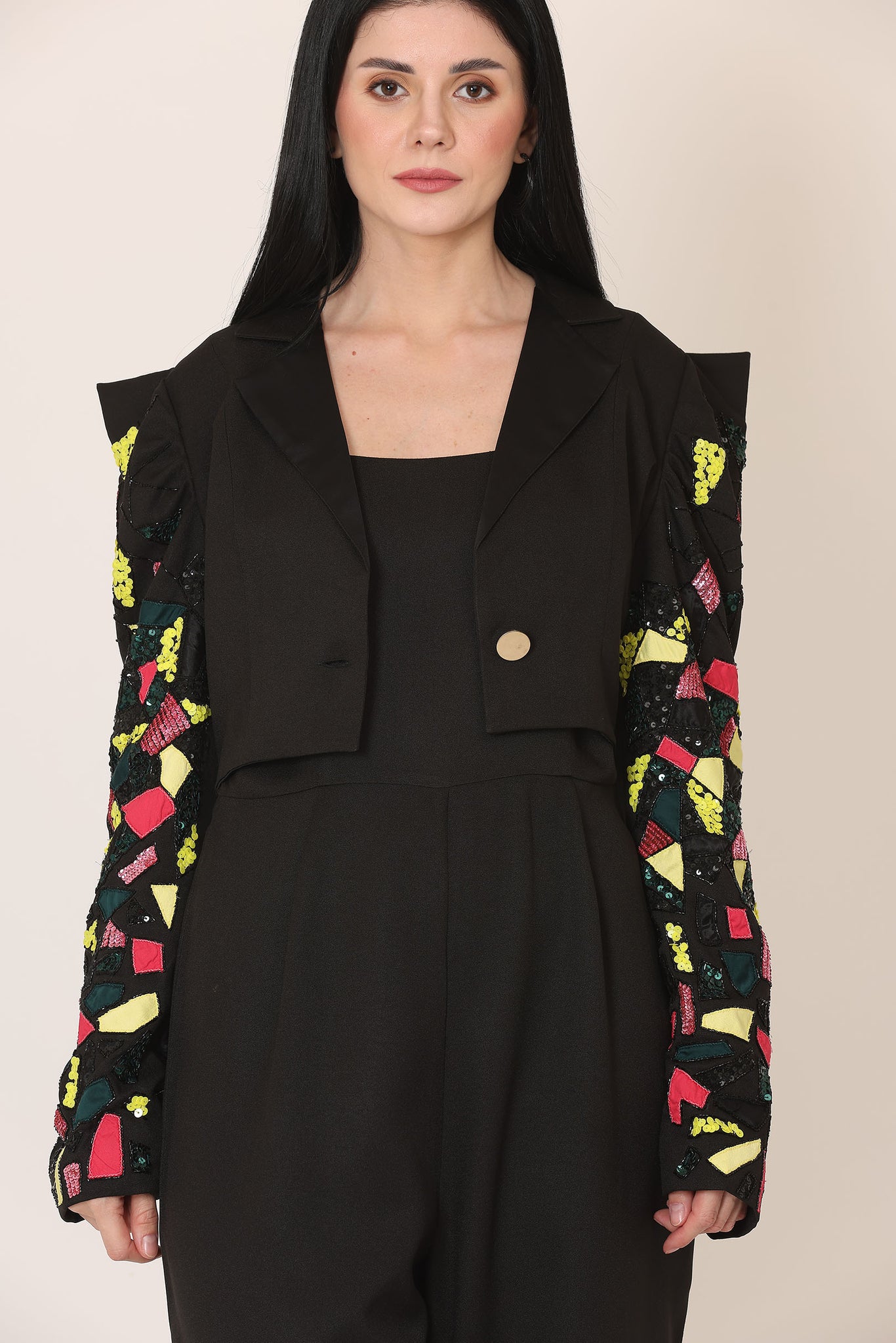 A black sleeveless jumpsuit paired with a colourful appliqué jacket. The jumpsuit comes with an H-square neck that gives it a neat and modern shape. The cropped jacket has a notch collar, single-button opening, and power shoulders for added structure. The full sleeves are highlighted with bright appliqué work, bringing a pop of colour to the outfit.
