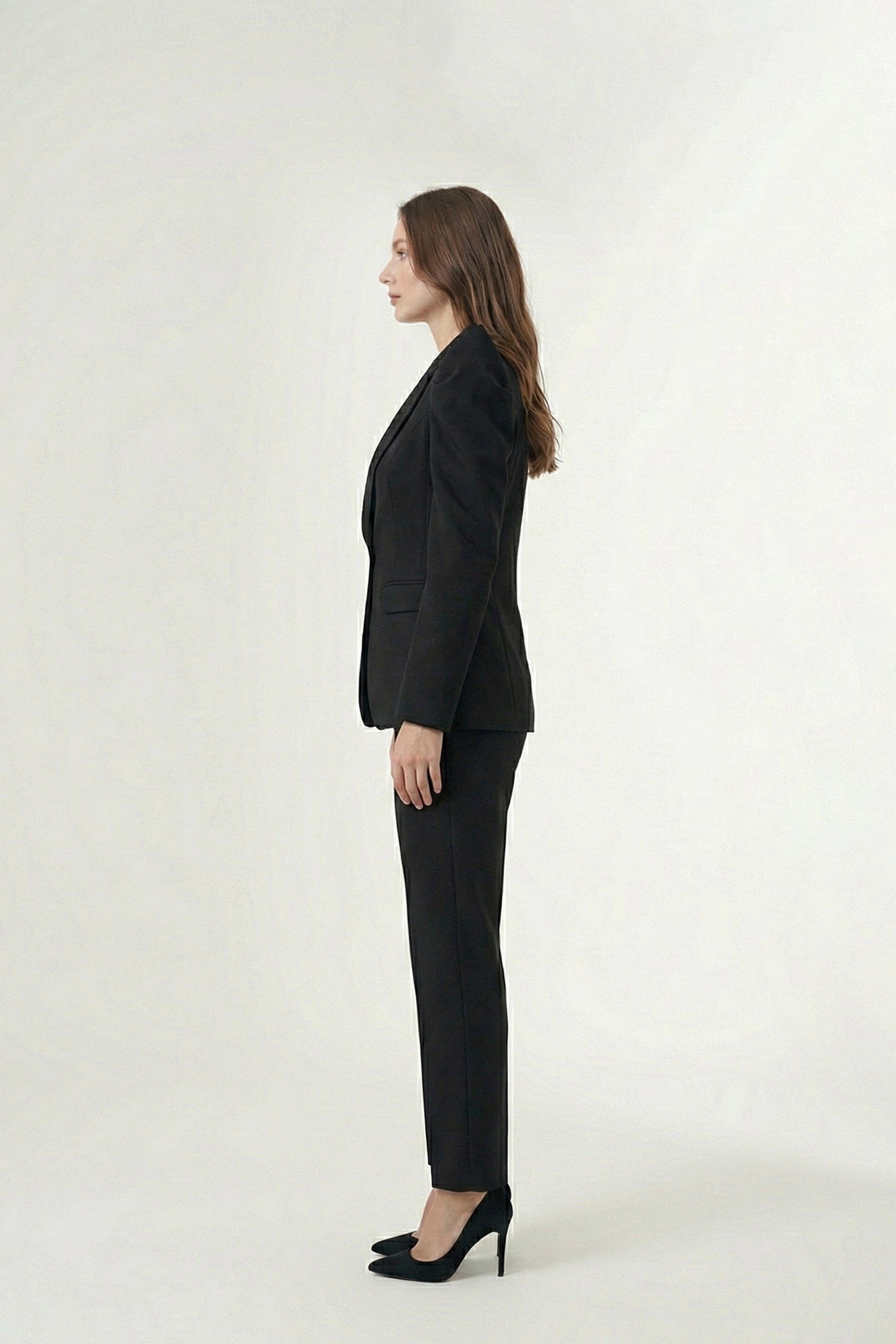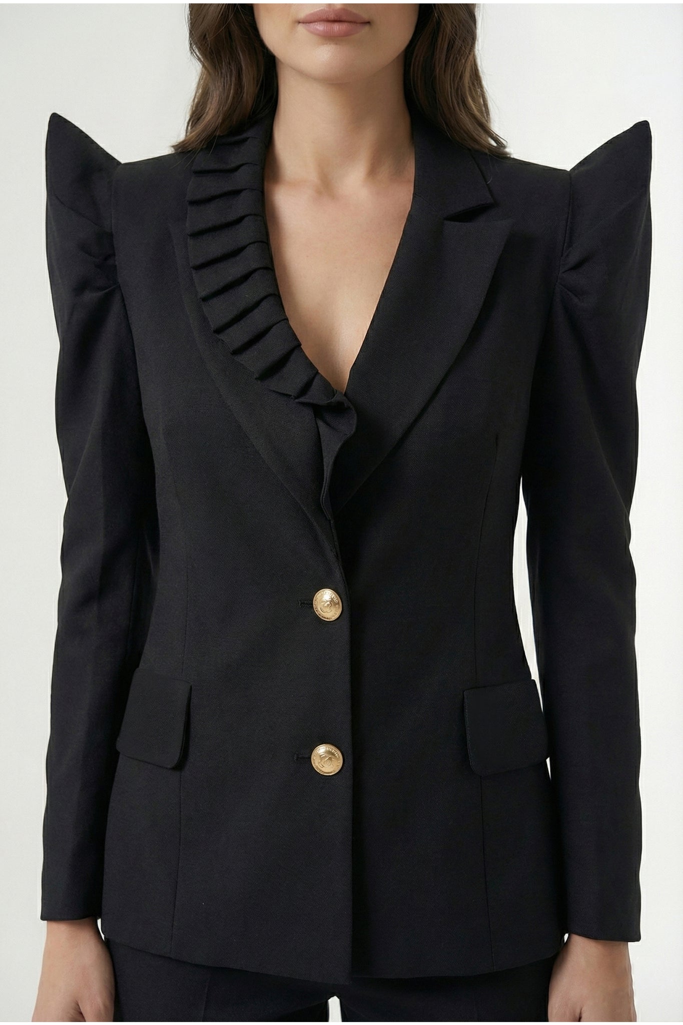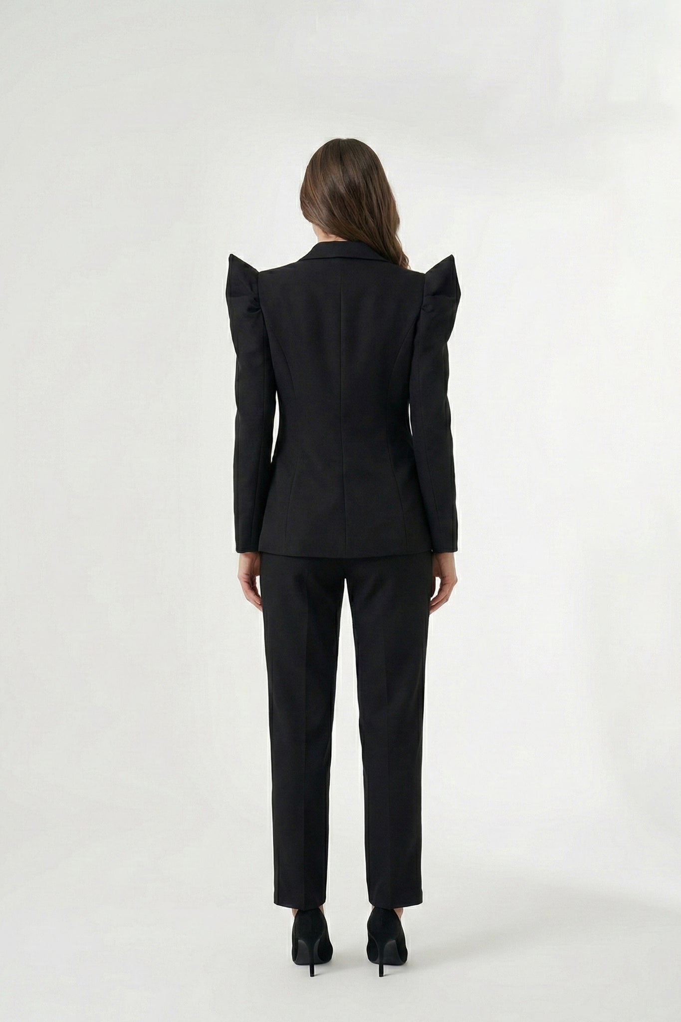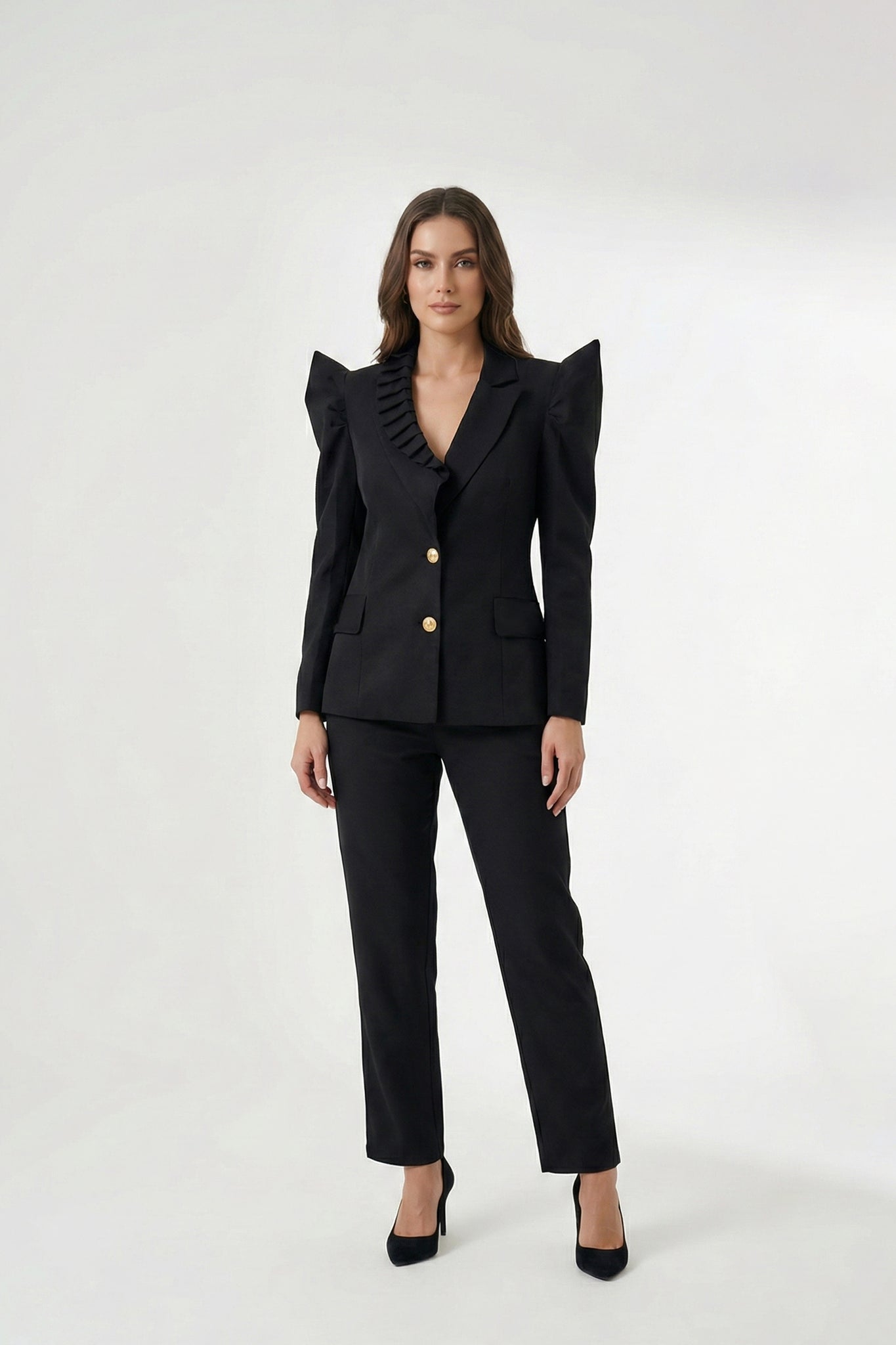 This black structured co-ord set brings a bold, sculpted elegance to power dressing. The blazer features dramatic statement shoulders and a finely pleated V-neck detail that adds texture and sophistication. Gold-tone buttons and flap pockets enhance the tailored finish. Paired with straight-fit trousers, the set offers a sleek, elongated silhouette.