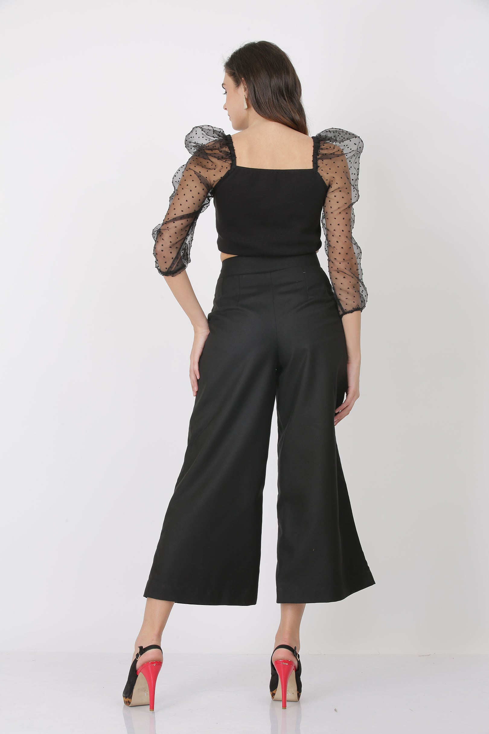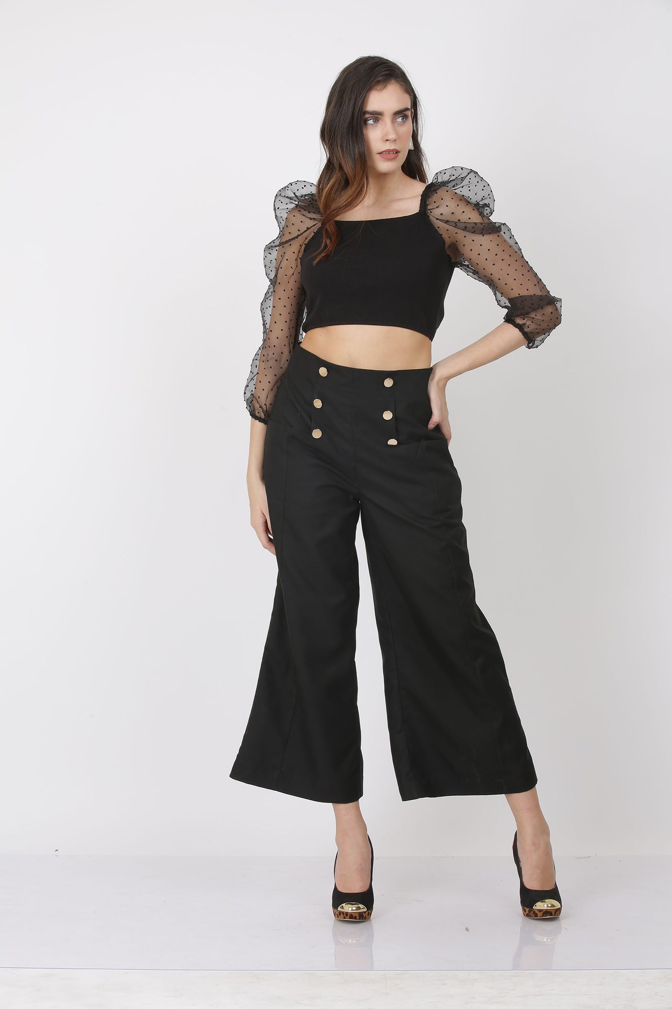 Chic black co-ord set features a crop top with sheer polka-dot puff sleeves, adding a playful yet elegant touch to the look. It is paired with high-waisted wide-leg trousers, detailed with statement gold buttons that enhance the silhouette with a modern, structured finish. Perfect for a trendy, sophisticated ensemble that stands out effortlessly.