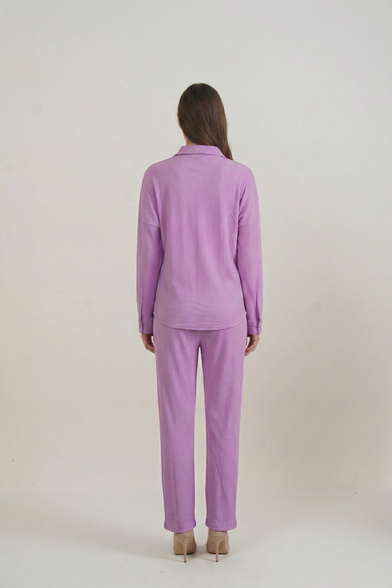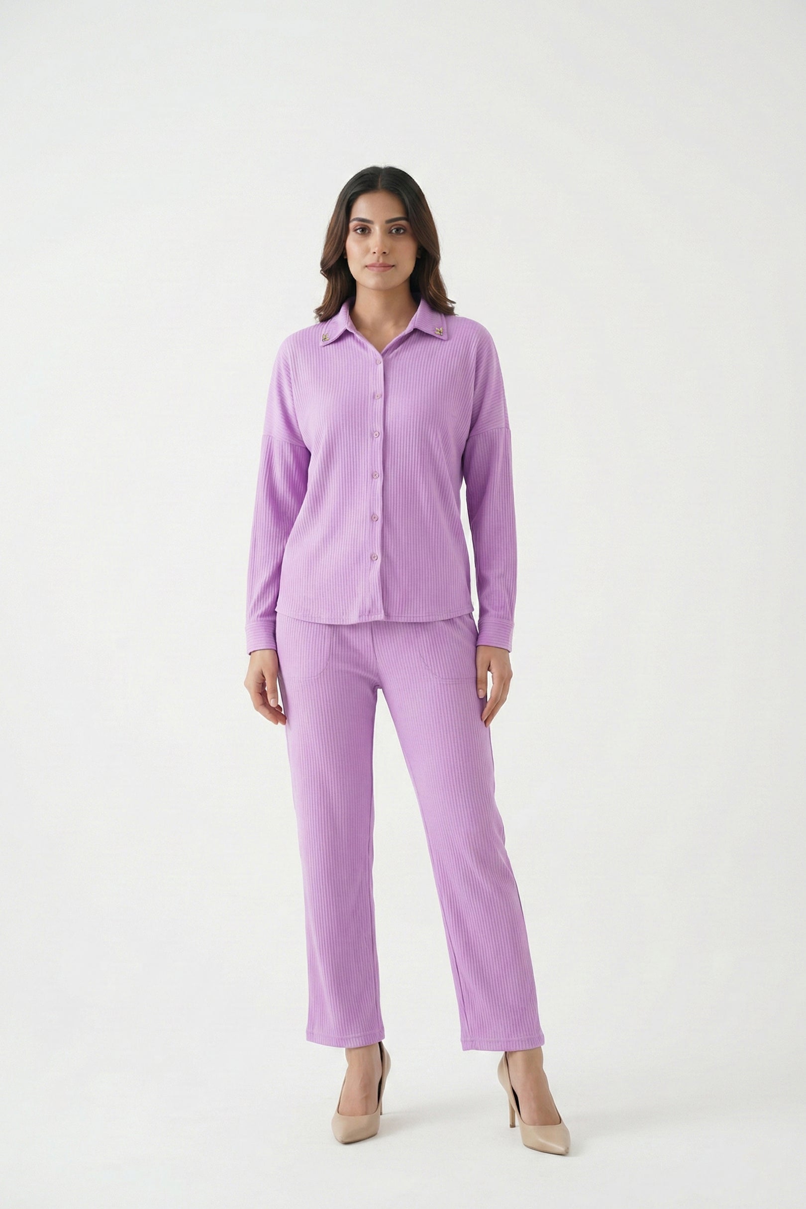 This lilac co-ord set offers effortless comfort with a refined, minimal aesthetic. The button-down shirt features a relaxed fit with a classic collar and subtle ribbed texture that adds soft structure to the look. Paired with matching straight-fit pants, the set provides easy movement and an understated, coordinated style.