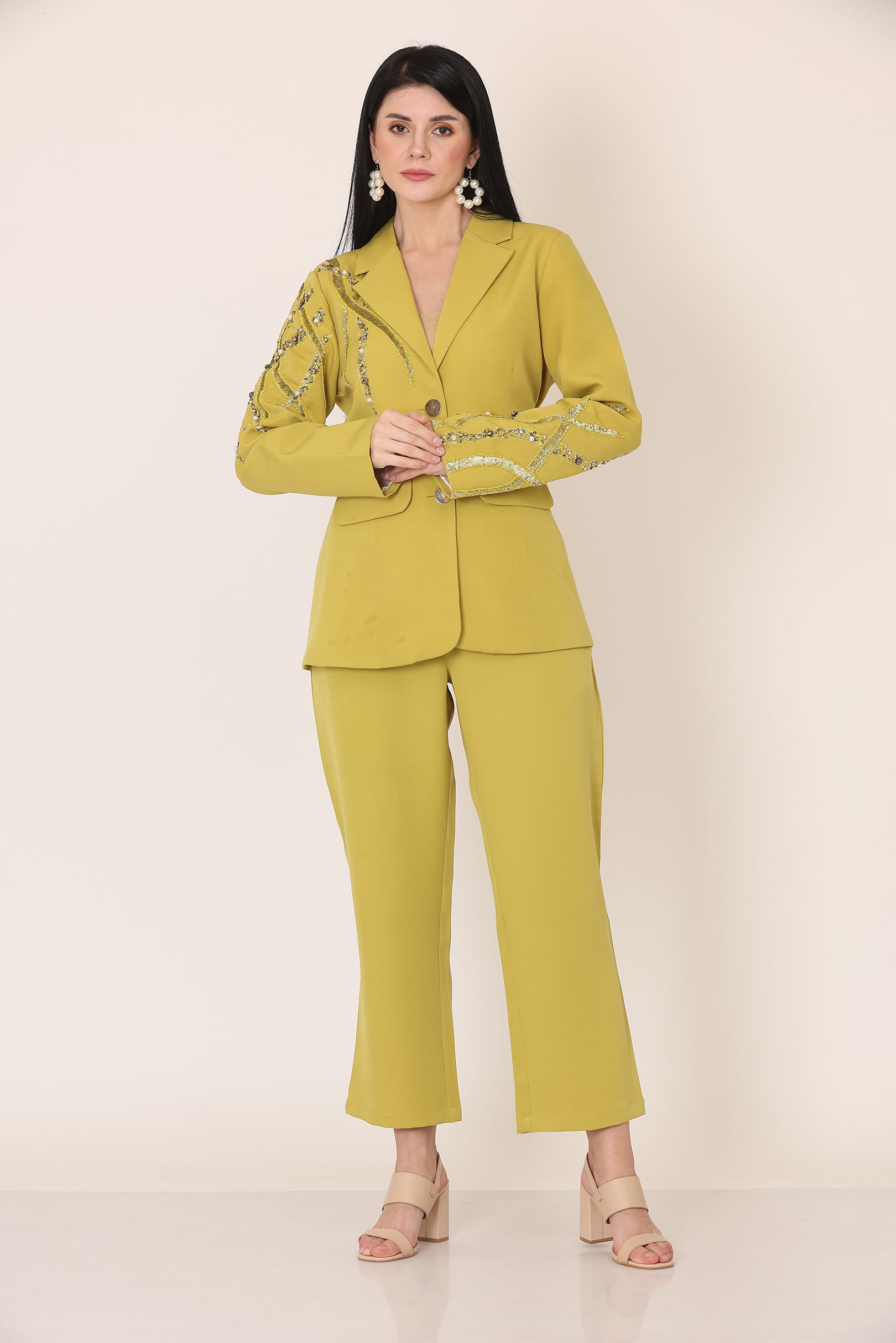 A refined lime green notch-collar coat featuring functional front pockets, a polished double-button opening, and intricate hand-work embroidery on the sleeves and front. Paired with tailored ankle-length pants designed with a clean front-fly closure, this set offers a sophisticated and modern silhouette.