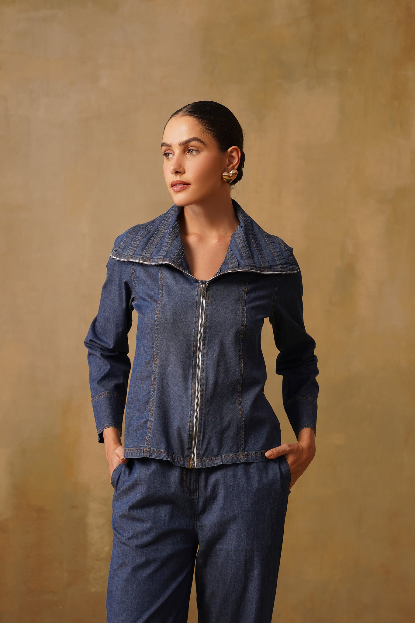 Contemporary cotton denim co-ord set with a front-zip jacket and stylish pintuked wide collar. Paired with matching denim pants with pockets, and back elastic for a relaxed waistline with front hook closure