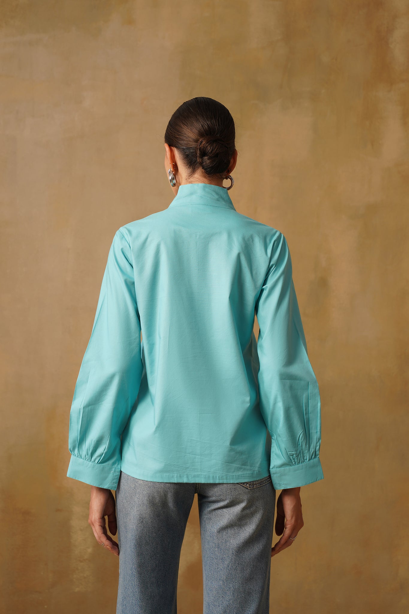 Poplin front-neck tie, full sleeves top enhanced with golden show buckle adding a structured finish to the outfit