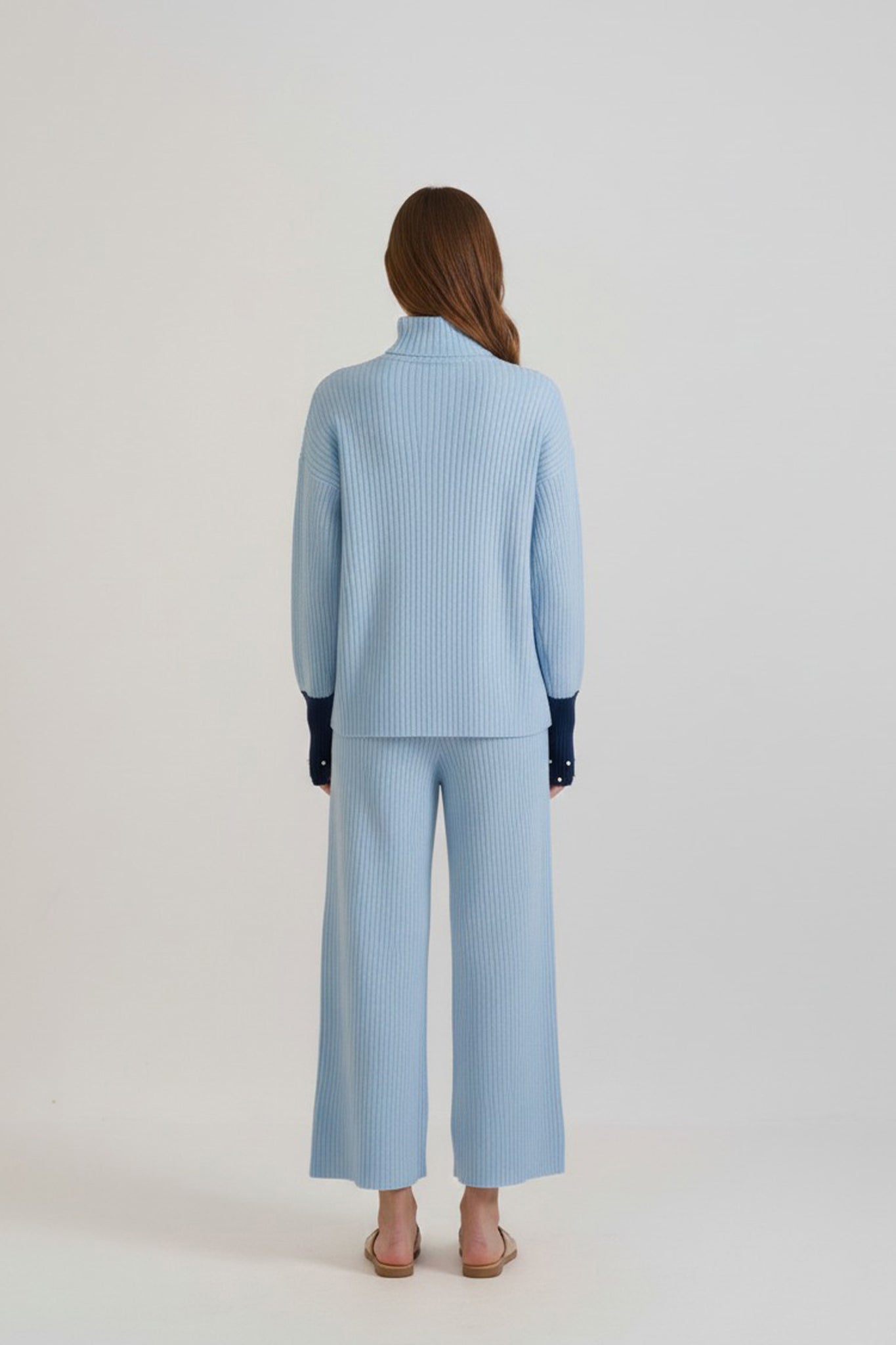 This sky-blue knit co-ord set offers a blend of comfort and contemporary elegance. The relaxed high-neck sweater features a soft ribbed texture and is elevated with contrasting navy cuffs adorned with delicate pearl embellishments for a refined touch. Paired with matching wide-leg ribbed pants, the set delivers an effortlessly chic silhouette that feels cozy yet stylish.