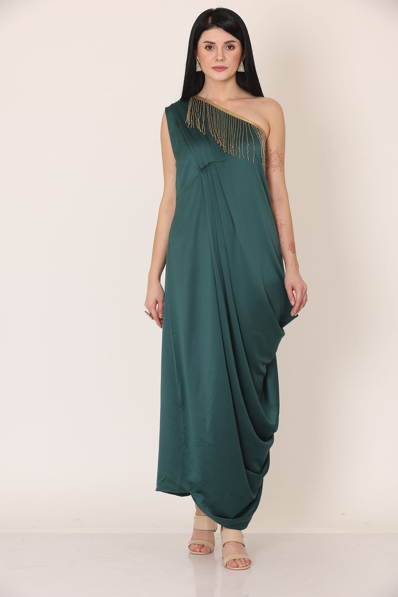 Make a statement in effortless elegance with this deep teal one-shoulder draped dress. Crafted in a fluid, luxe fabric, the silhouette features soft pleating and an artfully draped fall that flatters the body with graceful movement. The asymmetrical neckline is highlighted with delicate gold fringe detailing, adding a touch of festive glamour and refined drama.