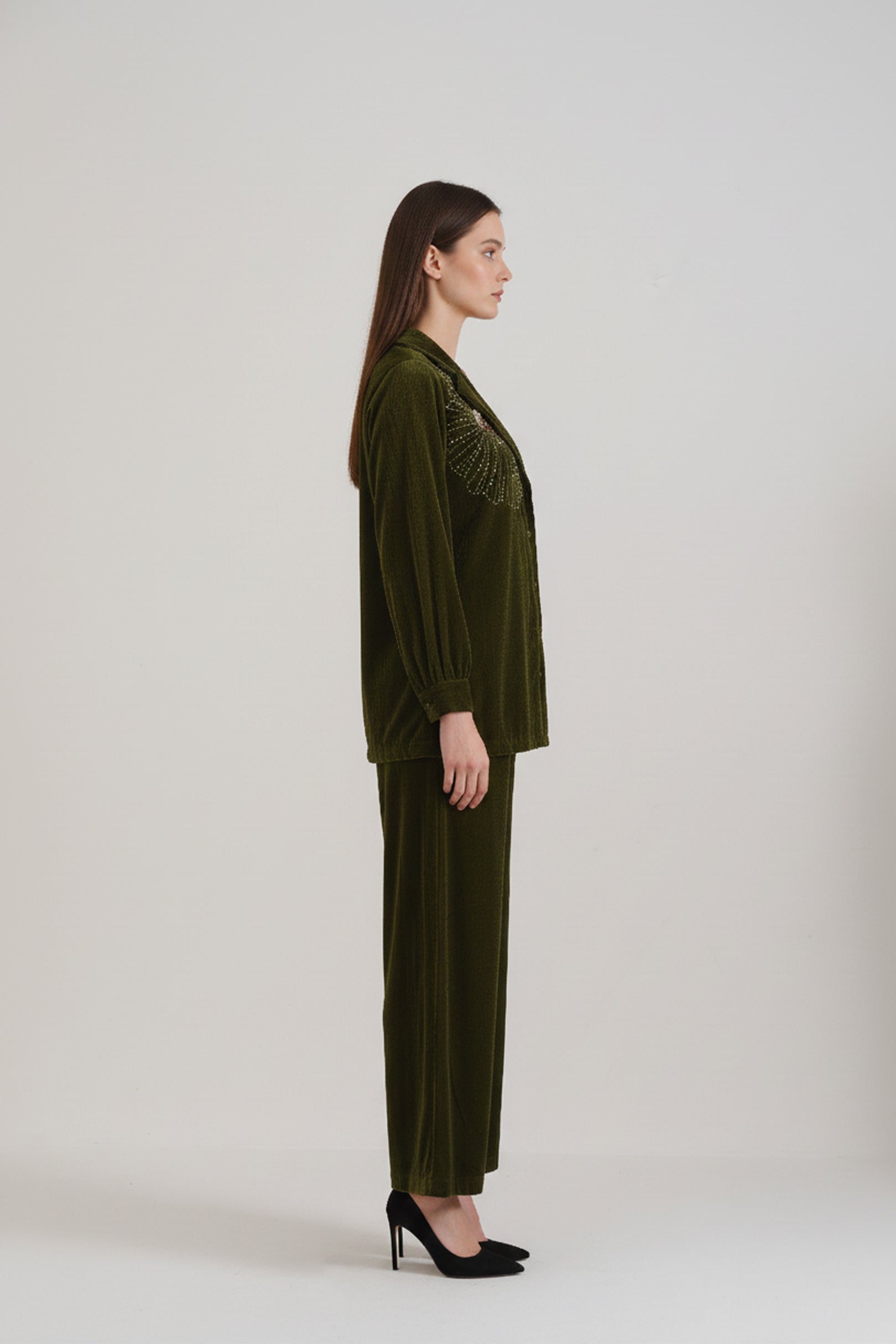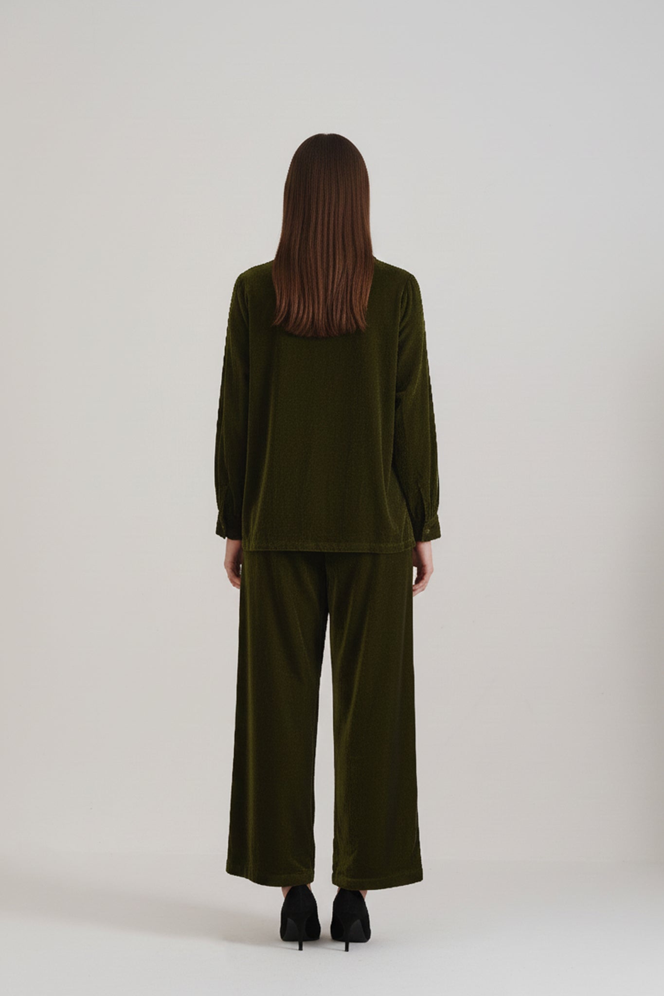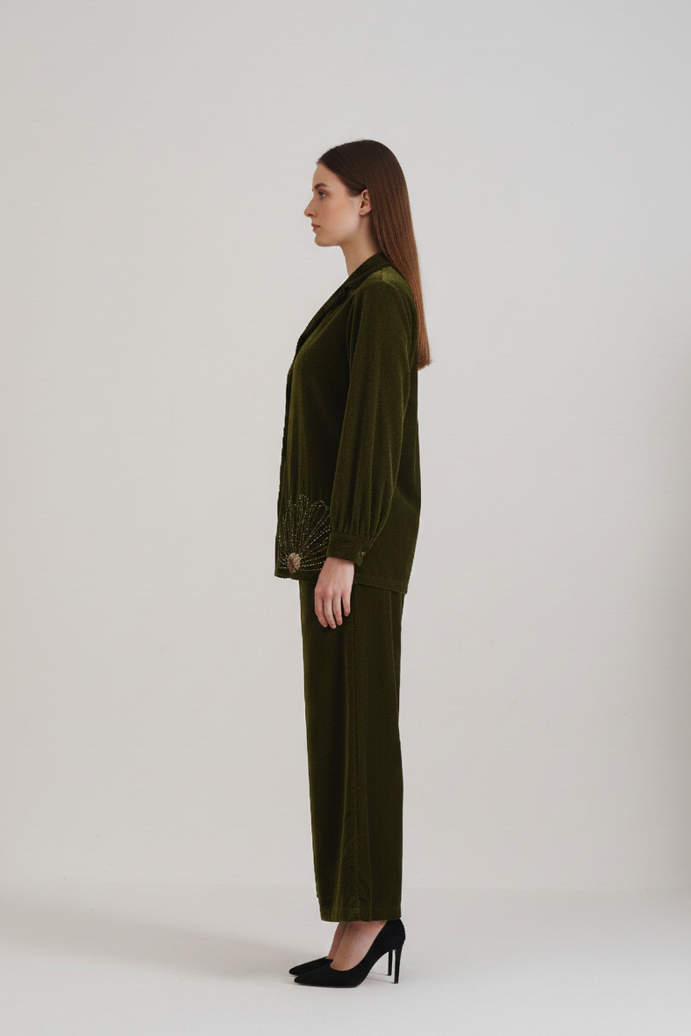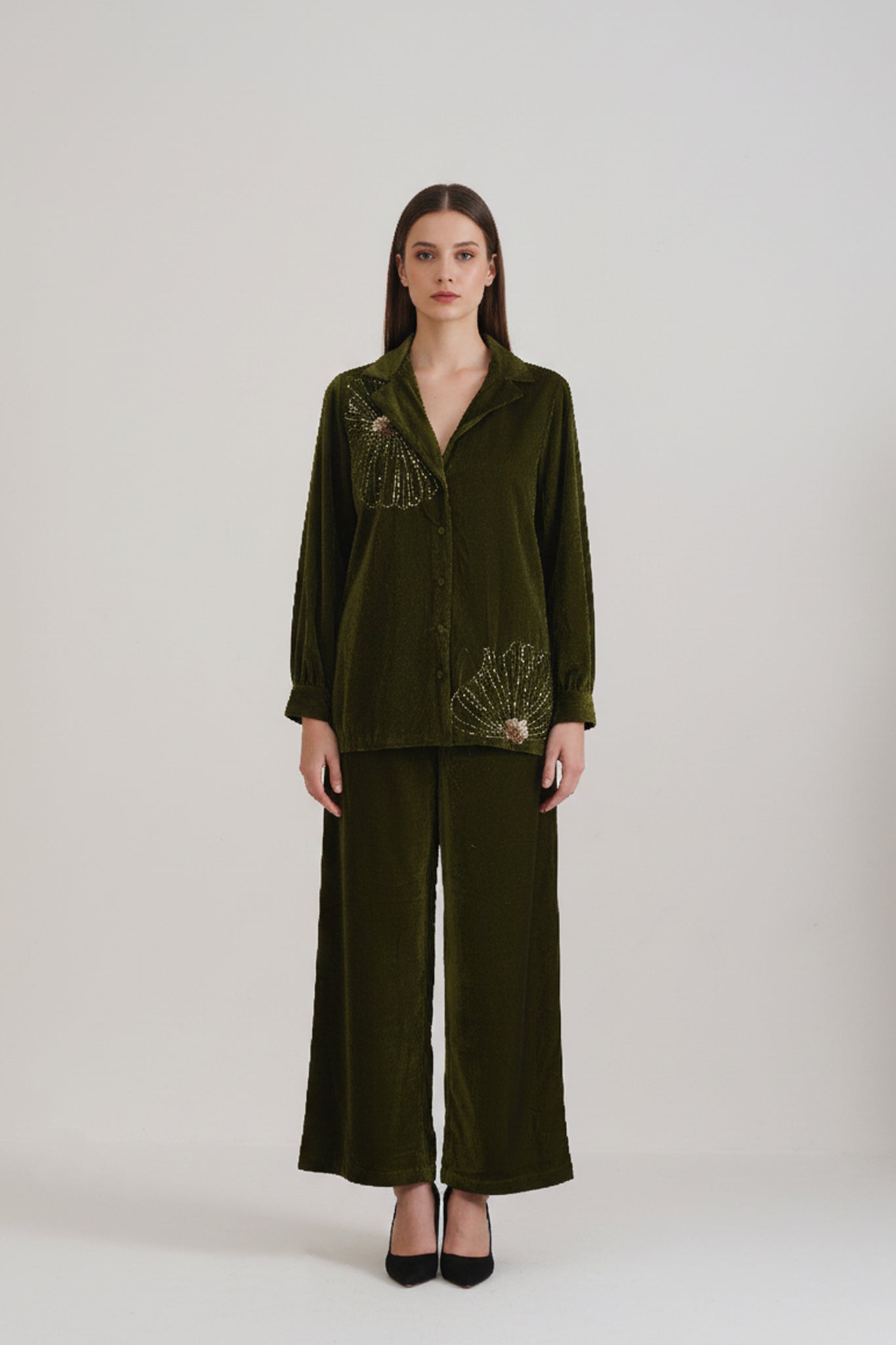 Elevate your festive wardrobe with this rich olive green co-ord set, crafted in a soft, luxurious velvet fabric. The shirt features a relaxed silhouette with a classic collar, button-down front, and gently gathered sleeves for an effortless drape. Delicate hand-embellished motifs on the shoulder and hem add a refined touch of shimmer, enhancing the set’s elegant appeal. Paired with wide-leg trousers for a flowy, comfortable fit.