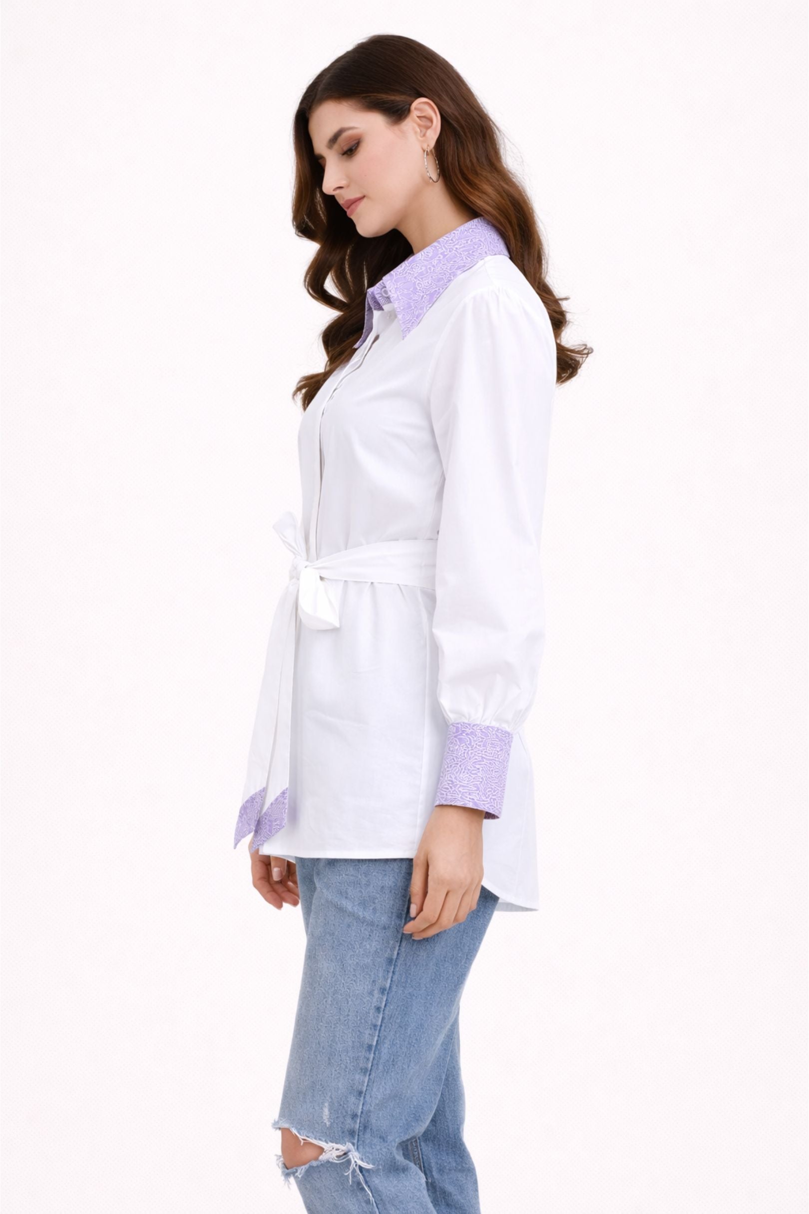This crisp white shirt is designed with a refined blend of classic tailoring and subtle handcrafted detailing. Featuring a smart collared neckline highlighted with soft lilac printed accents, it brings a fresh and elegant touch to everyday dressing. The full sleeves are finished with matching printed cuffs, adding visual interest while maintaining a clean silhouette. A fabric tie-up belt at the waist allows for a flattering, adjustable fit, enhancing the structured yet relaxed appeal of the shirt.